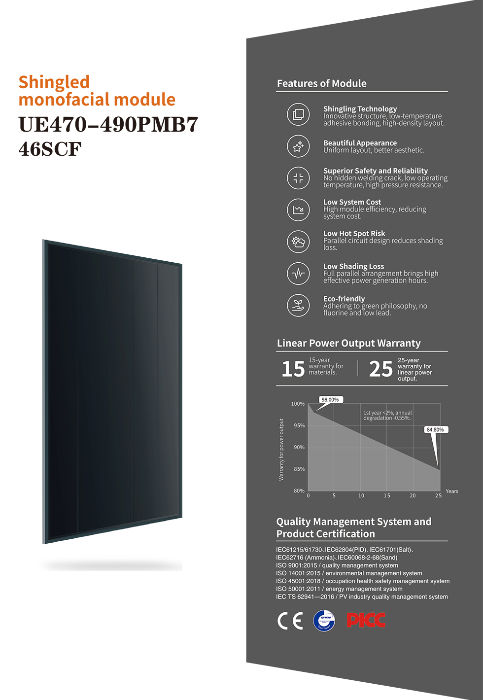 IEC/CE/TUV/CSA/CEC/ULUnited Energy founded in 2009, National high-tech enterprise,focus on solar panel R&D obtained more than 100 patents.