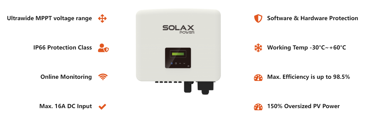 The SolaX X3 Pro is amongst some of the most efficient residential & commercial string solar inverters available on the market today, boasting a massive 98.5% efficiency and with a maximum PV input voltage of 1100V, you can ensure that you are making the most out of your solar energy.