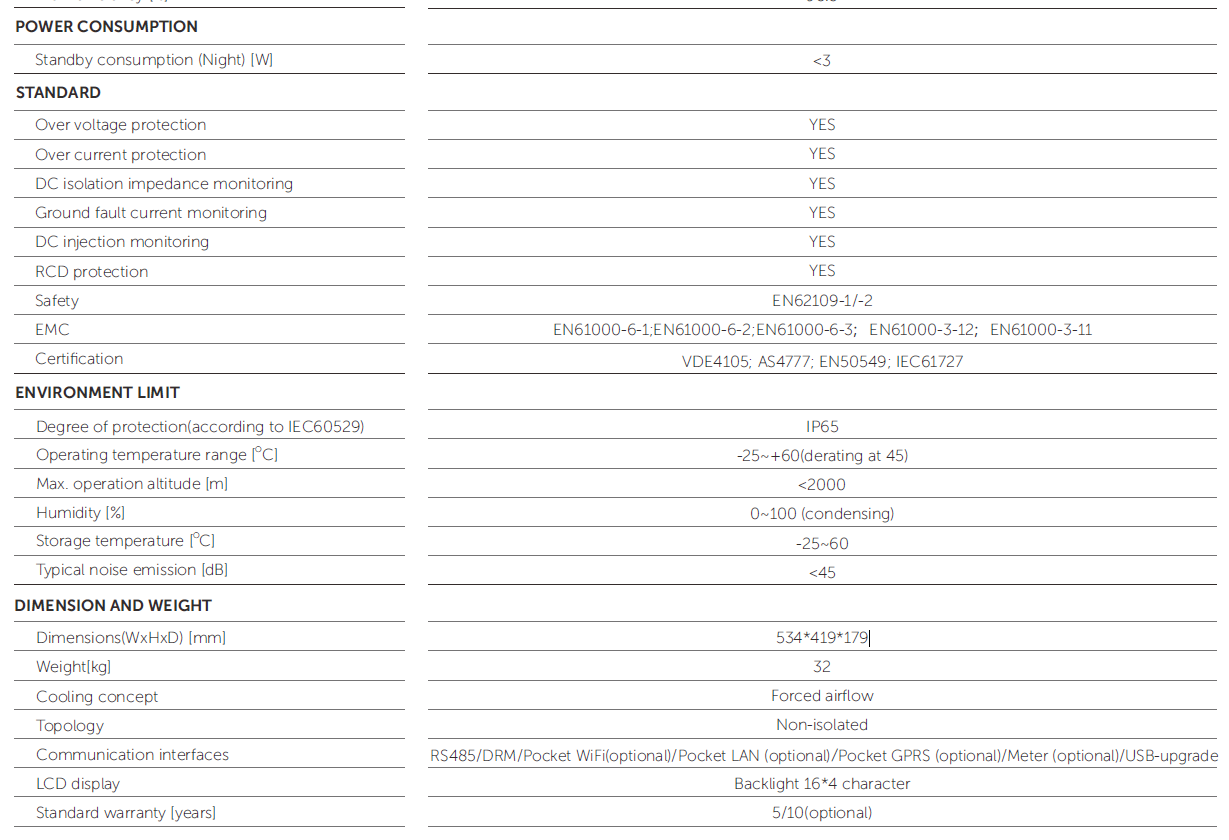 Certificate: EN62109-1/-2, EN61000-6-1;EN61000-6-2;EN61000-6-3;EN61000-3-12;EN61000-3-11, VDE4105; AS4777; EN50549; IEC61727